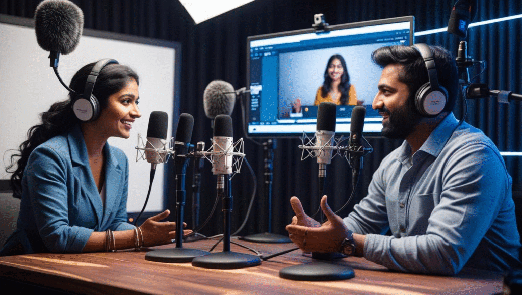 Capture your podcasts and interviews with multi-angle camera setups for dynamic, professional video content.